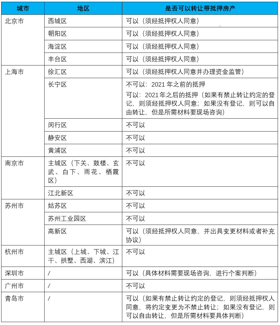 由以上表格可知,截至2月底大部分城市对带抵押房产办理转让过户登记的态度仍是趋于保守的,主要原因是《民法典》第四百零六条的规定尚未细化和落实到当地登记规范中,因此不动产登记机构沿用的还是旧法框架下的操作。