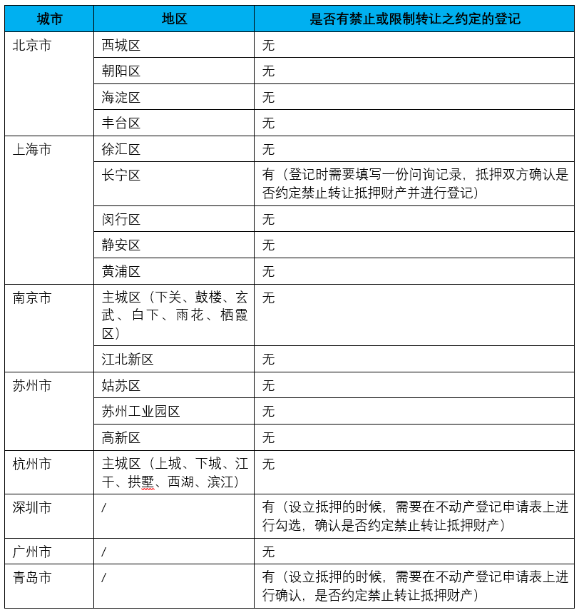 目前来看,深圳、青岛以及上海市长宁区初步具备了实际操作的条件。根据《深圳市不动产登记申请表(适用抵押权首次登记)》,其中询问笔录部分的第4个询问事项即为“是否有在抵押期间禁止或限制抵押财产转让的约定?”抵押权人和抵押人可以对是否同意进行勾选,如果双方选“是”,则该约定会被记入不动产登记信息,并且该不动产的后续转让会受到限制。